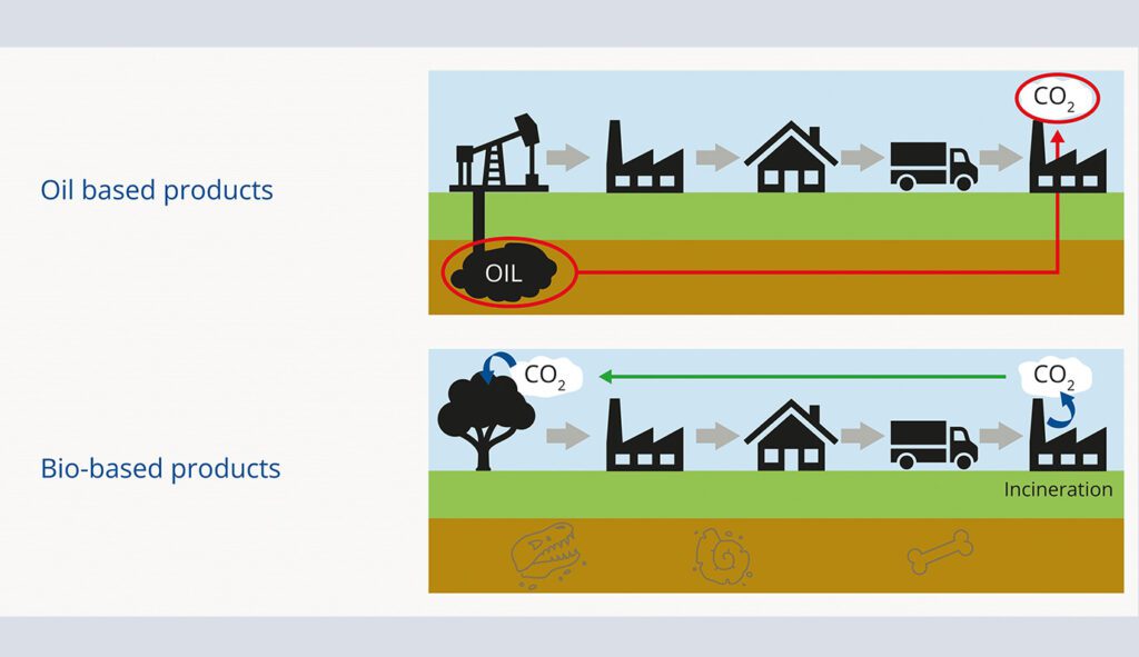 I materiali bio possono presentare un profilo ambientale migliore e il loro utilizzo può contribuire alla nascita di un’economia a bassi contenuti di carbonio perché nella loro evoluzione, essi assorbono CO2 (Fig. 1). Se è vero che al termine della vita utile la CO2 viene reimmessa nell’atmosfera, non si aggiunge nuova CO2 come quando si usa il petrolio. In alcuni casi, i prodotti bio possono fornire nuove o superiori proprietà ai prodotti standard a base di petrolio.