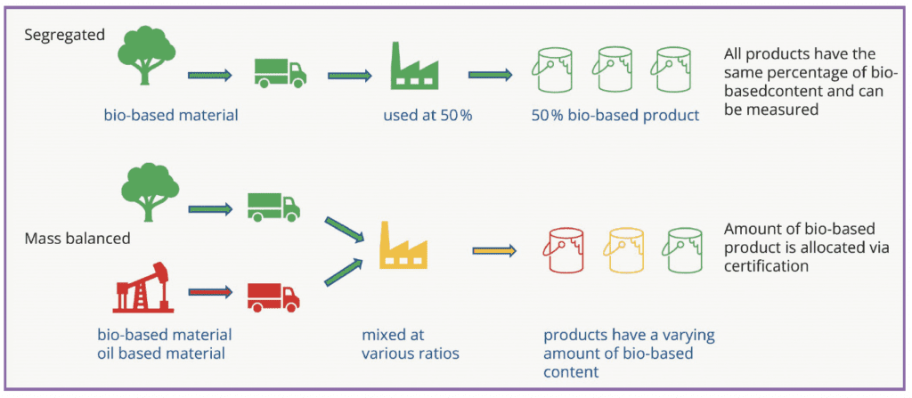 Un materiale viene considerato bio se ricavato interamente o parzialmente dalla biomassa. Questi prodotti possono anche essere definiti bio-rinnovabili o riproducibili. Utilizzando i prodotti bio, non ci si affida più all’impiego dei combustibili fossili come materie prime. I prodotti bio possono essere classificati come segregati o a bilancio di massa (Fig. 2). Un prodotto bio segregato è ovviamente preferibile in quanto l‘utilizzatore conosce sempre la quantità di materiale bio presente nel prodotto. Questa può anche essere misurata con l’analisi