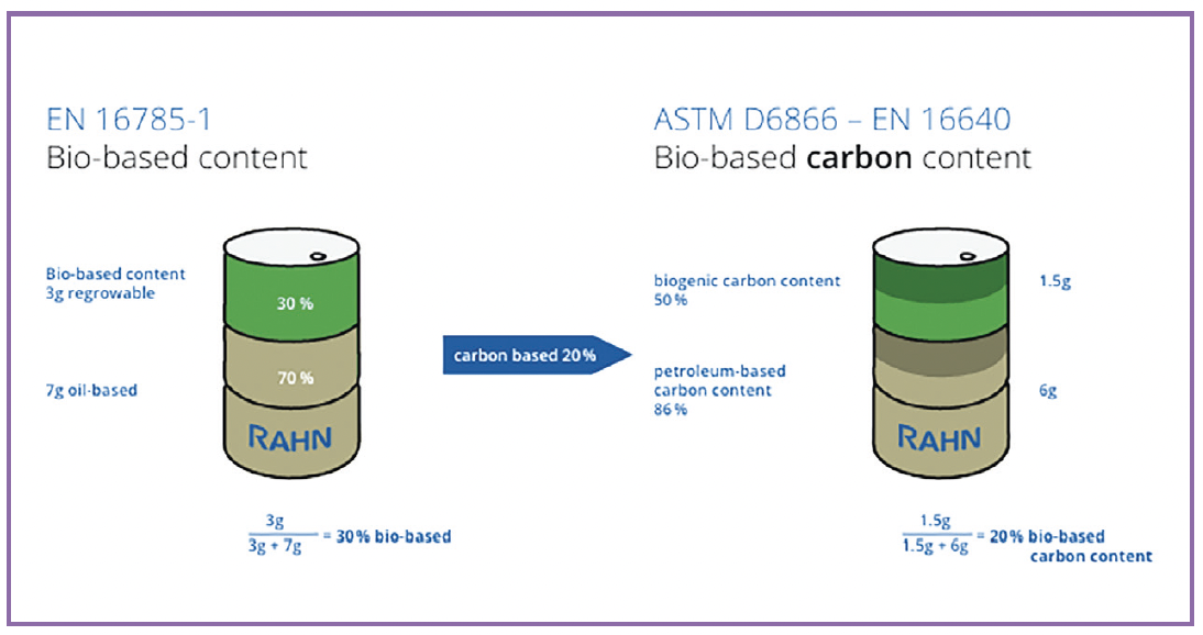 In Figura 3 sono illustrati i due metodi principali adottati per comunicare il contenuto di materia prima di origine naturale: il contenuto di carbonio bio che utilizza un valore quantitativo e misurabile di Carbonio 14 per calcolare il contenuto bio e il semplice contenuto bio, che viene calcolato dalla quantità totale di materiale bio utilizzato per realizzare il prodotto finale (che tiene conto di carbonio, idrogeno, ossigeno e azoto). Questi valori non sono sempre simili.
