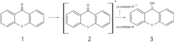 I fotoiniziatori radicalici sono molecole caratterizzate dalla capacità di assorbire energia ad una determinata lunghezza d’onda. Il loro scopo è quello di generare radicali liberi, che, iniziando la reazione di polimerizzazione, portano all’indurimento del formulato. I fotoiniziatori più utilizzati nell’industria assorbono alle lunghezze d’onda dello spettro ultravioletto e chi usa questi sistemi spesso utilizza delle lampade specifiche come fonte di energia. In funzione del loro meccanismo di reazione, i fotoiniziatori si dividono in due famiglie: fotoiniziatori di tipo 1 e fotoiniziatori di tipo 2.