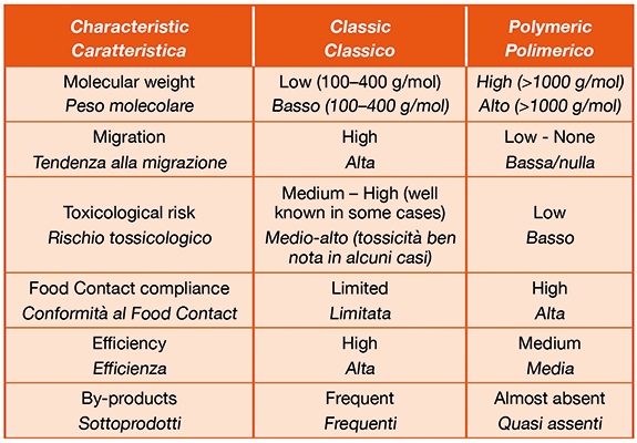 La riduzione della migrazione si può ottenere in due modi: il primo consiste nella funzionalizzazione dei fotoiniziatori o delle ammine, rendendoli reattivi nei confronti dei radicali e diventando parte del reticolo polimerico riducono la capacità di migrare. Un altro metodo ampiamente usato consiste nell’aumentare il peso molecolare rendendo il fotoiniziatore o l’ammina un polimero. Il volume di queste molecole è significativamente più alto rispetto a quelli classici, portando i sottoprodotti a rimanere all’interno del reticolo. Tra i prodotti più sviluppati in funzione delle proprietà desiderate, possiamo trovare fotoiniziatori polimerici disposti in catene lineari, graftati o iper-ramificati. Le ammine e i fotoiniziatori polimerici sono ottimi per applicazioni dove le normative sono più stringenti, come il food packaging, dove i limiti di esposizione si misurano p.p.b. (parti per miliardo). Essendo molecole molto più grosse, hanno una velocità di reazione un po’ più lenta rispetto ai sistemi classici ma possono essere modificate per lavorare anche in sistemi a bassa energia, garantendo una maggior sicurezza e sostenibilità.