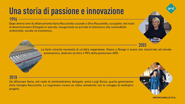 Nel tempo, questo impianto ha visto grandi avanzamenti tecnologici ed ora, Ard Raccanello può essere soddisfatta di avere uno degli stabilimenti produttivi tra i più avanzati d’Europa a livello tecnologico, di automazione e sostenibilità industriale.