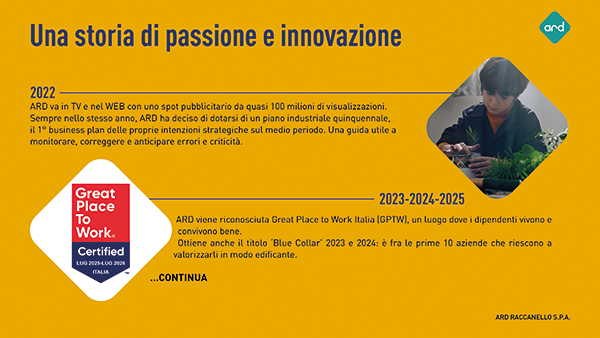 L’implementazione di questa filosofia aziendale è parte integrante di una precisa strategia di crescita sostenibile che ha l’obiettivo di creare un ambiente di lavoro sempre più flessibile in cui le persone possano essere protagoniste ed esprimere al meglio le proprie potenzialità, dentro e fuori l’azienda. Ed è anche per questo che ARD Raccanello ha ottenuto la Certificazione ‘Great Place to Work 24/25’.