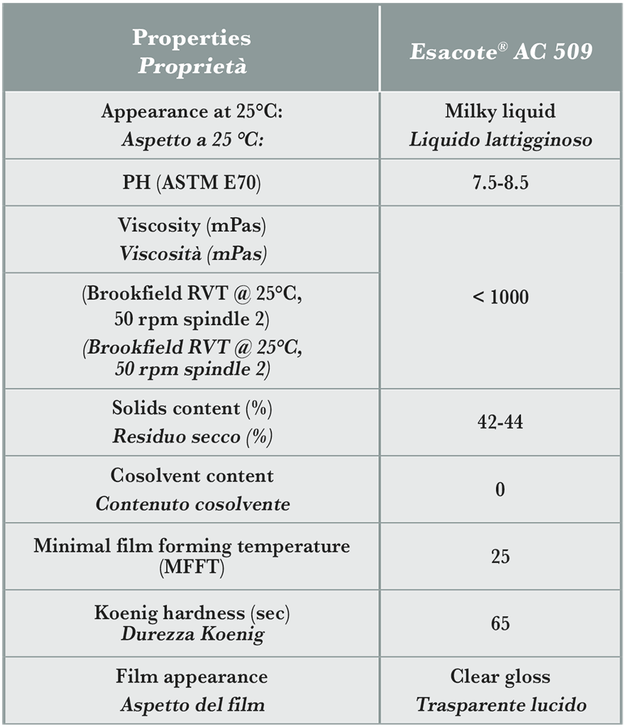 Lo sviluppo di Esacote® AC 509 rappresenta per Lamberti una espansione strategica nel mercato del DTM, combinando le alte prestazioni richieste dal settore con i requisiti di so-stenibilità. La resina mostra ottima adesione ed eccellenti resistenze alla corrosione e all’ac-qua, andando quindi a soddisfare le richieste fondamentali del mercato.