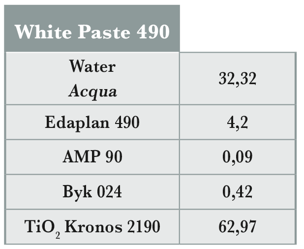 Nella Tabella 2 riportiamo le proprietà del legante, la formulazione standard utilizzata nello studio, e i risultati alla nebbia salina.