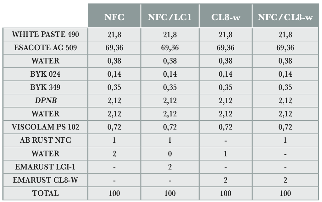 Nelle Tabelle 4 e 5 riportiamo le formulazioni testate (fondo pigmentato bianco) e le foto dei pannelli dopo esposizione in nebbia salina. È evidente che la combinazione Emarust NFC/LC1 sia quella che fornisce il risultato migliore.