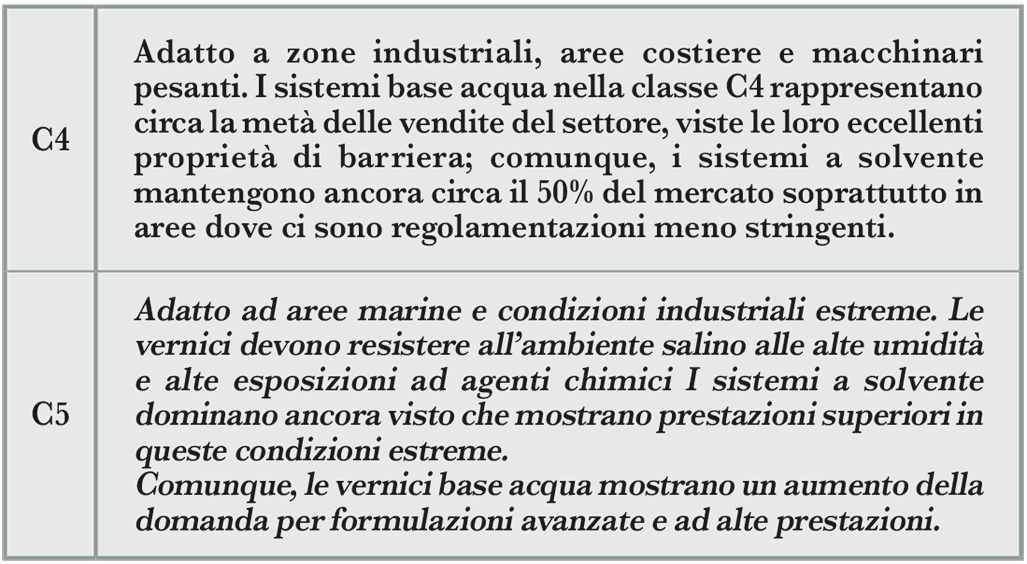 Considerando le classi di corrosione descritte nella ISO 129444-2, si è ipotizzato che l’area più interessante per sviluppare una nuova resina fosse il segmento C4-C5 (vedi sotto) dove la richiesta di performance superiori è in grado di apprezzare il valore aggiunto di una soluzione innovativa.