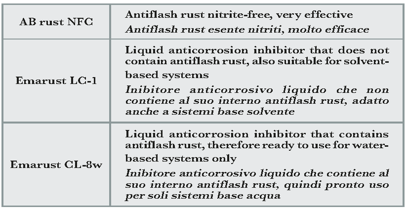 In collaborazione con Labema sono stati svolti dei test di anticorrosione utilizzando alcuni pigmenti anticorrosivi e additivi antiflash rust da loro pro-dotti, che elenchiamo nella Tabella 3.
