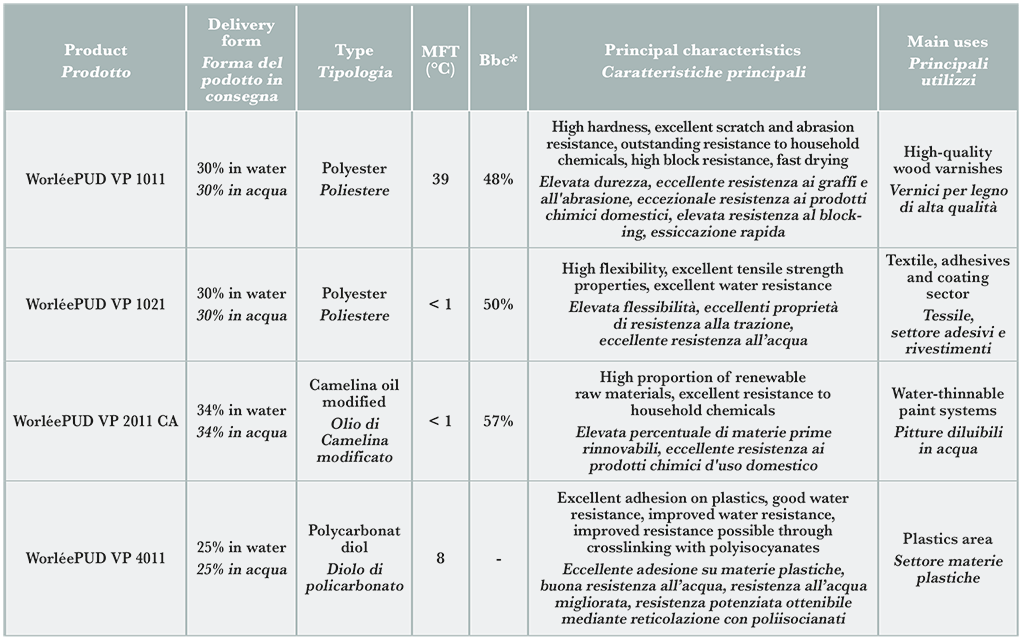 WorléePUD VP 2011 CA rappresenta una nuova gene-razione di dispersioni poliu-retaniche che raggiungono sia l’eccellenza tecnica che la responsabilità ecologica.