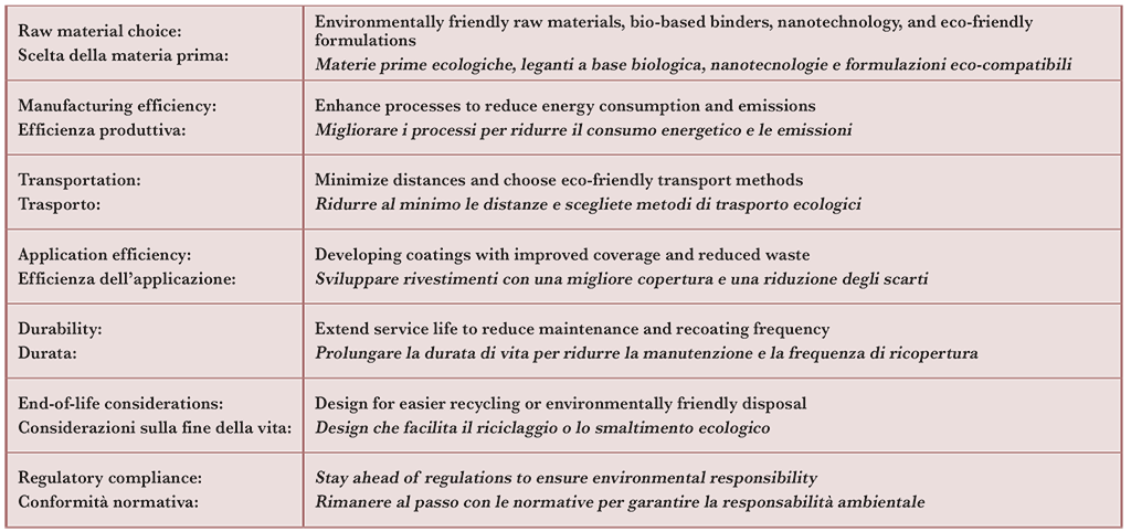 I rivestimenti contribuiscono alla sostenibilità incorporando formulazioni efficienti dal punto di vista delle risorse e dando priorità alla durata dei prodotti finiti, riducendo così al minimo la necessità di rivestimenti frequenti. Pertanto, la sostenibilità è un aspetto critico nel mercato delle pitture e vernici continua a plasmare le dinamiche del settore. La stessa Life Cycle Assessment (LCA) dei rivestimenti, che esamina gli impatti ambientali dalla produzione allo smaltimento, è influenzata da vari fattori tecnici (Tab. 1).