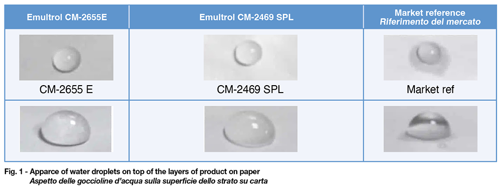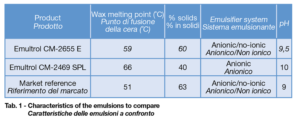 The present study compares the hydrophobic behaviour of Emultrol CM-2655 E and CM-2469 SPL paraffin wax emulsions with a product from a competitor (see Table 1).