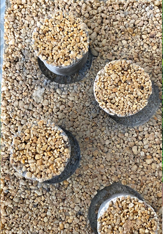 The binder formulated for the Stone Carpet is flexible, similar to traditional two-component polyurethanes systems (2K PUs), but superior to two-component polyaspartic resin systems (2K PAS). This feature affects the mechanical properties of the Stone Carpet, measured at 14 days, in terms of flexural and compressive strength.