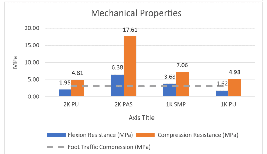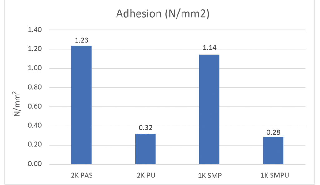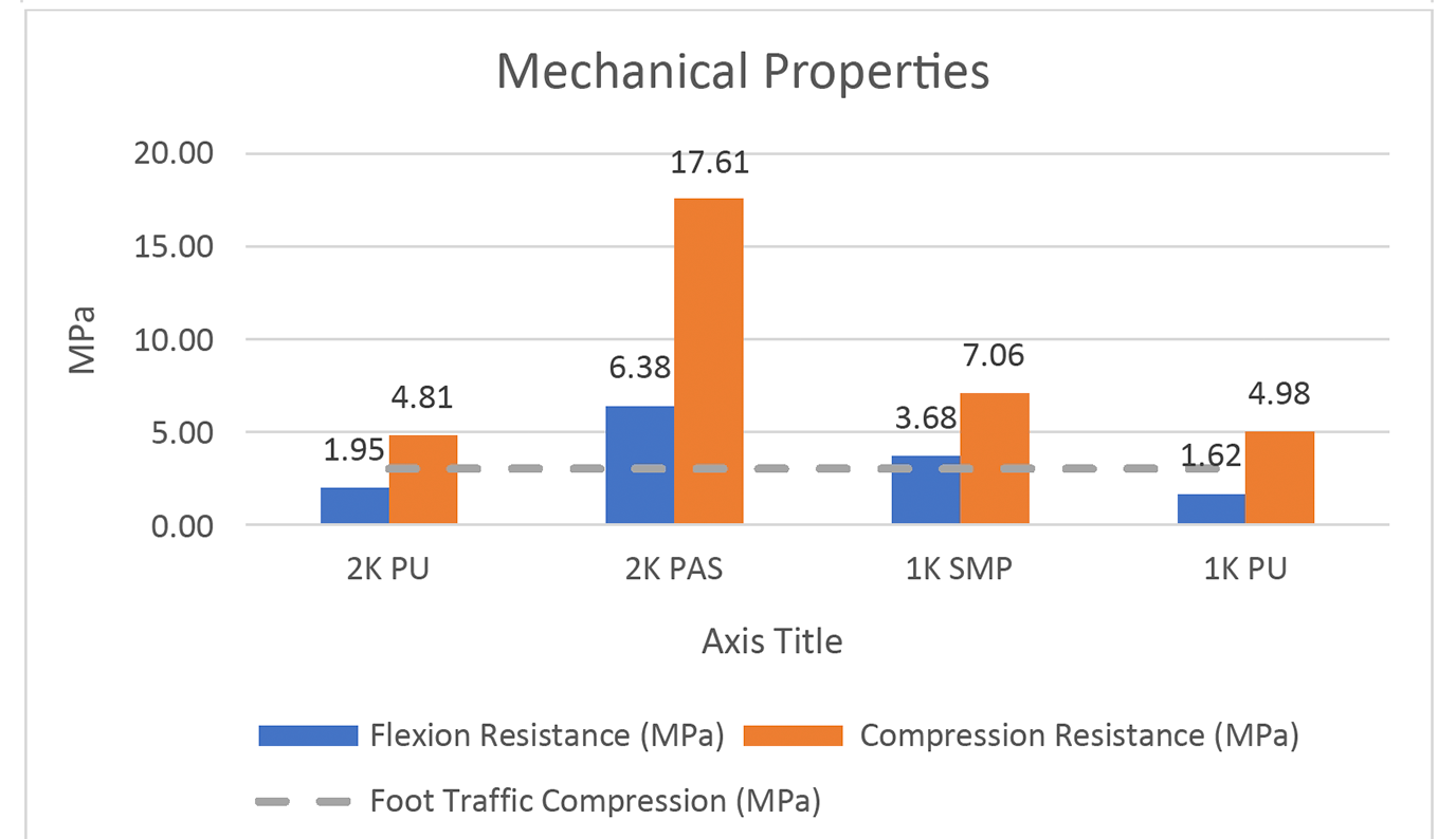 The flexural strength of the system based on silane modified polymers (1K SMP) is equal to 3.68 MPa, higher than polyurethane systems, and lower than the polyaspartic system which is too rigid and therefore not suitable for all applications. Similarly, the compressive strength of the modified silane polymer system (1K SMP) has a compressive strength of 7 MPa, higher than polyurethane systems, which have values slightly higher than the minimum value required for foot traffic, which must be ≥ 3MPa, and lower than two-component polyaspartic systems. The adhesion strength measured by Pull Off testing after 14 days shows high values for the modified silane polymer system (1K SMP), much higher than polyurethane and similar to the polyaspartic system.