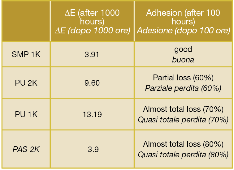 Finally, a fundamental property is the resistance to atmospheric aging, measured by accelerated aging in a QUV chamber, with a QUV B type lamp, and with alternating cycles of sun and condensation: