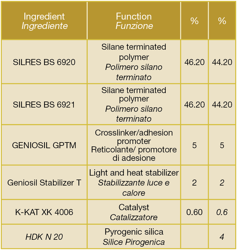 The formula indicative of the single-component binder based on modified silane polymer can be summarized in (Tab.1)
